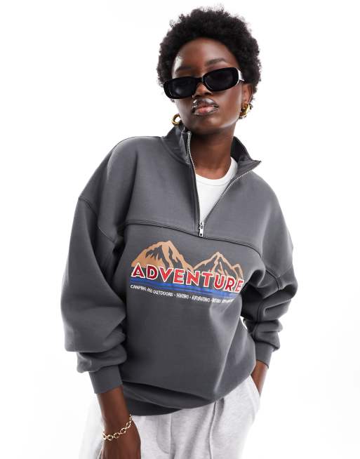 Cotton On – Mörkgrå sweatshirt med kort dragkedja vid halsen och bergstryck i retrostil