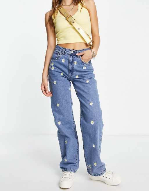 Cotton:On – Blå, lediga jeans med raka ben och blommigt broderi