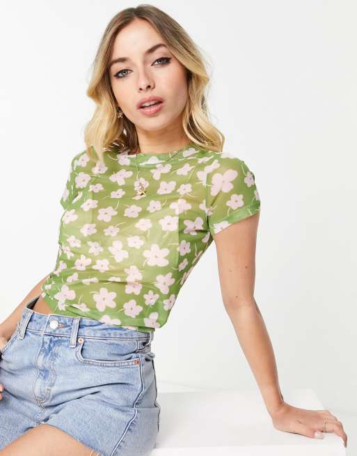 Cotton:On – Zoe – Grön, mönstrad crop top i mesh
