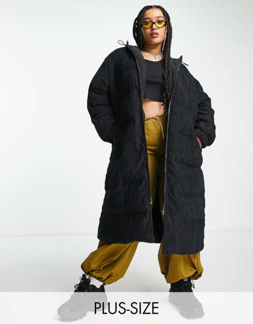Daisy Street Plus – Svart lång pufferkappa i manchester med huva