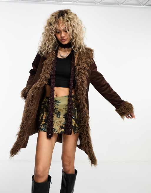 Daisy Street – Chokladbrun, lång kappa i fuskmocka och fårskinnsimitation
