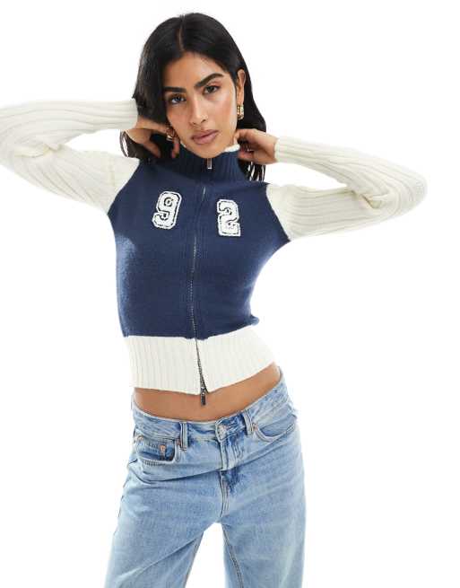 Daisy Street – Marinblå och krämvit, figurnära kofta med dragkedja