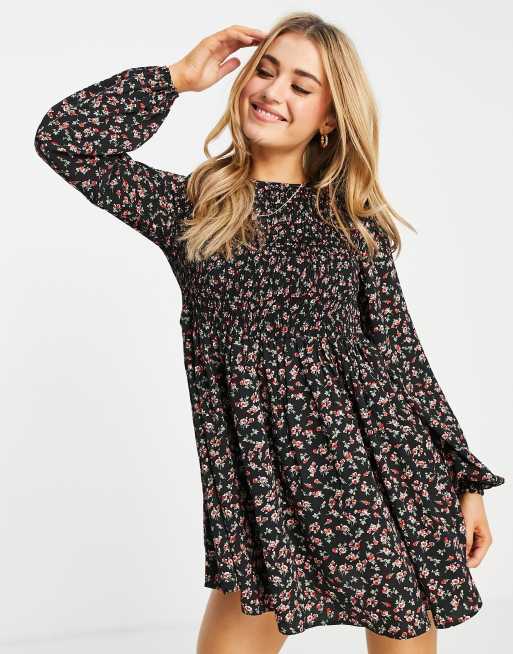 Daisy Street – Svartblommig figurnära miniklänning med långa ärmar
