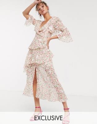 Dark Pink – Rosa småblommig maxiklänning med volanger och djup urringning