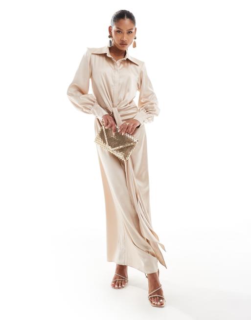 Daska – Brungrå maxi-skjortklänning i satin med snurrad knut