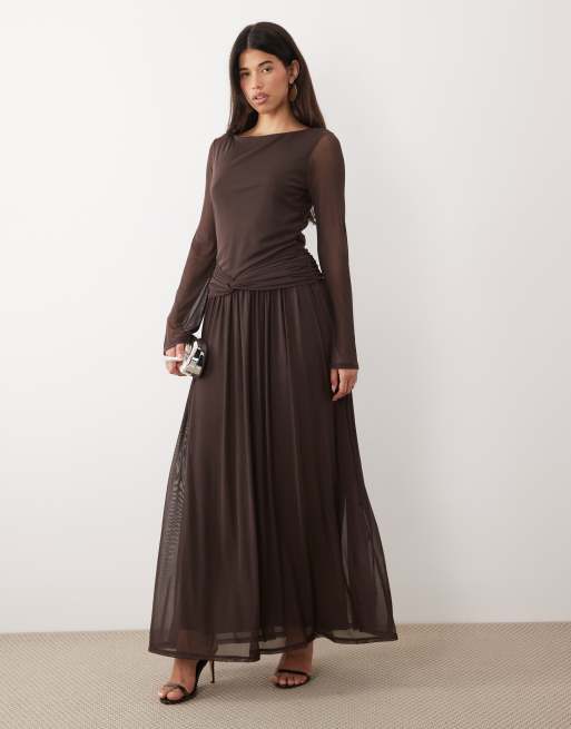 Daska – Chokladbrun maxiklänning i mesh med sänkt midja och snurrad detalj