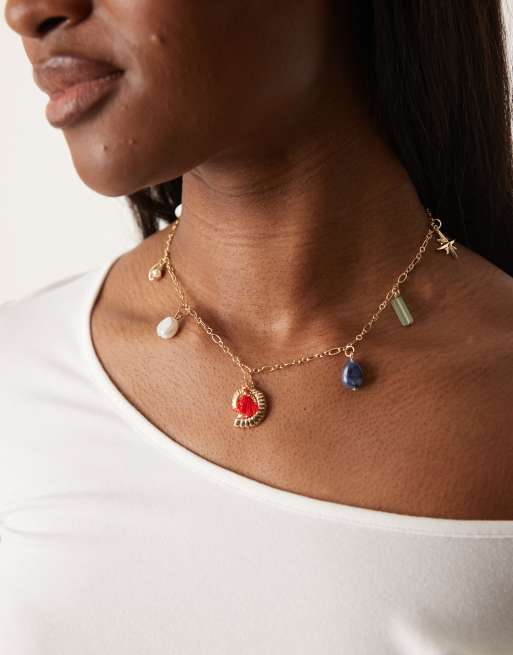 DesignB London – Guldfärgat halsband med flera snäckhängen och naturstenar