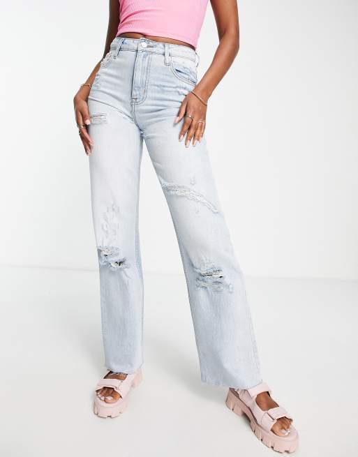 DTT – Ljusblå jeans med raka ben, råskuren fåll och knärevor