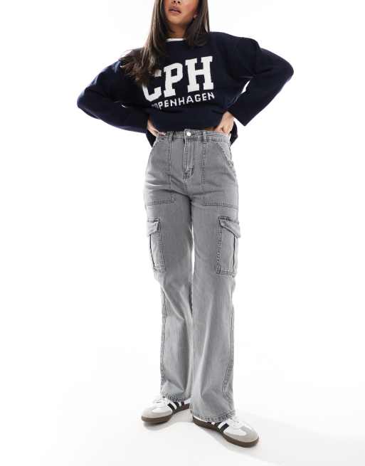 DTT – Molly – Ljusgrå cargojeans med hög midja och vida ben