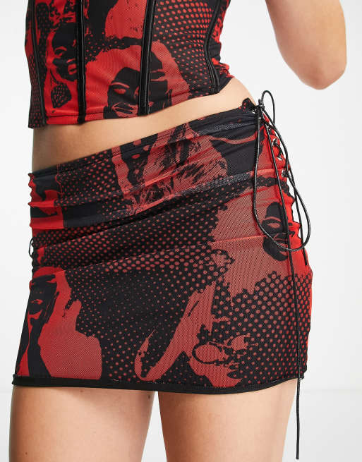 Edikted – Röd grungemönstrad, superkort minikjol med snörning i sidan, del av set