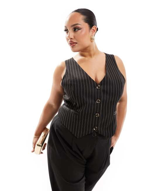 Extro & Vert Plus – Svart figursydd kostymväst med kritstrecksrandigt mönster