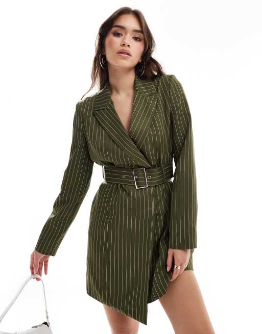 Extro & Vert – Kakifärgad, randig kavajklänning i minilängd med skärp