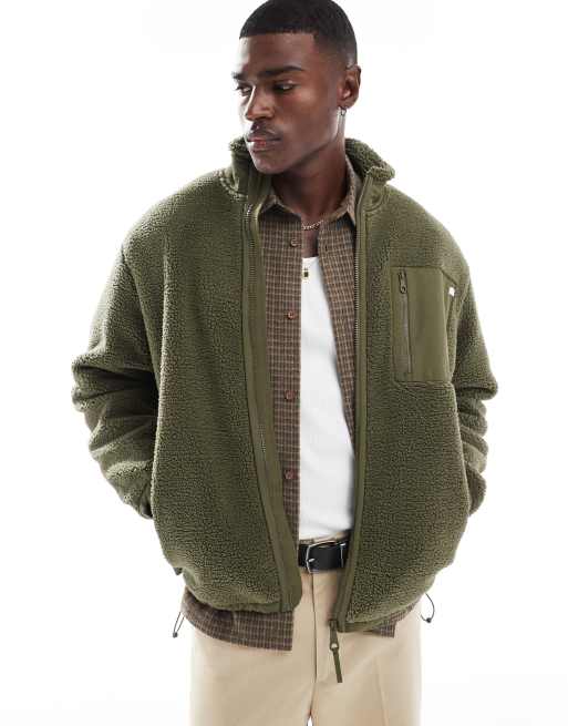 Farah – Khakigrön fleecejacka i ullimitation med dragkedja