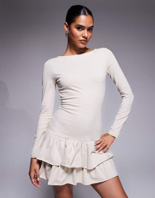 Fashionkilla – Ljusbeige, långärmad miniklänning i bomull med sänkt midja och volangfåll