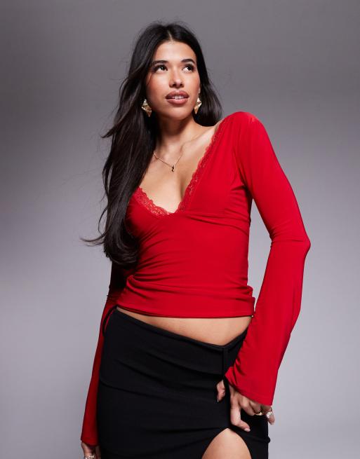 Fashionkilla – Röd, formande, silkig topp med v-ringning och spetskant i två lager