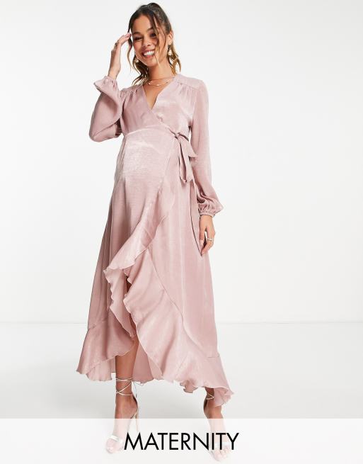 Flounce London Maternity – Rosemelerad maxiklänning med omlottdesign och långa ärmar av satin