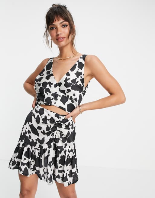 Flounce London – Komönstrad rynkad miniklänning med utskuren detalj