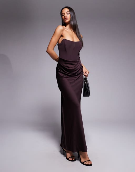Forever New – Mörkbrun, axelbandslös maxiklänning med korsett och drapering