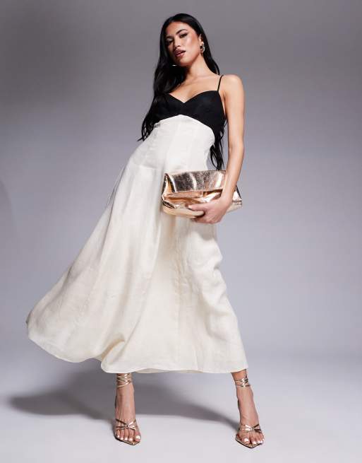Forever New – Svart och gräddvit midaxiklänning i linne med kontrastdetalj