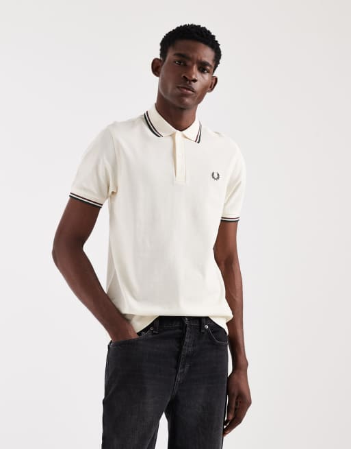 Fred Perry – Naturvit pikétröja med dubbla kantränder och logga