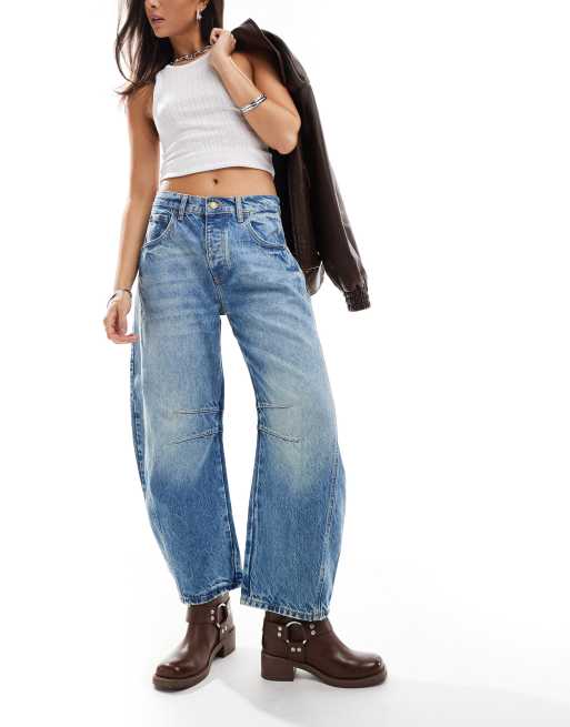 Free People – Good Luck – Blå barreljeans i mellanljus tvätt med medelhög midja