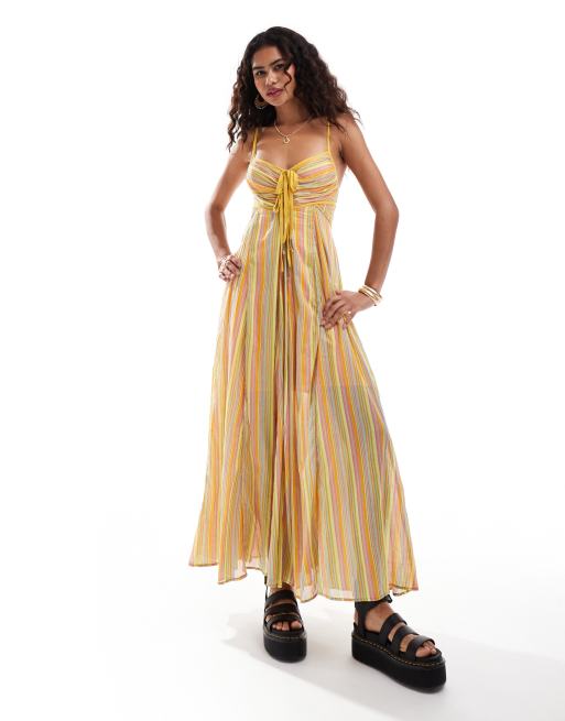 Free People – Gul, flerfärgad, randig maxiklänning med axelband i poplin