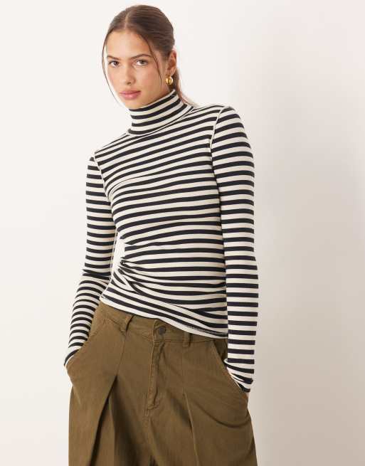 Free People – Svart, randig topp med halvpolokrage och långa ärmar