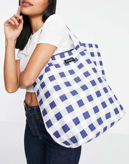 French Connection – Blå och vit, ginghamrutig toteväska i canvas