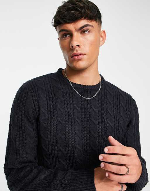 French Connection – Marinblå, kabelstickad tröja med rund halsringning av ylletyg