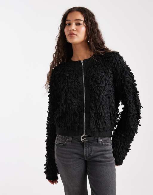 French Connection – Svart, lurvig, stickad kofta med dragkedja