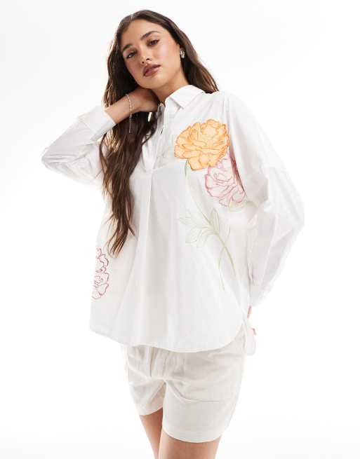 French Connection – Vit, blommigt broderad skjorta utan knäppning i bomull