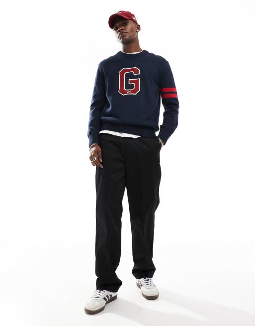 GANT – Marinblå, stickad tröja med rund halsringning och collegelogga