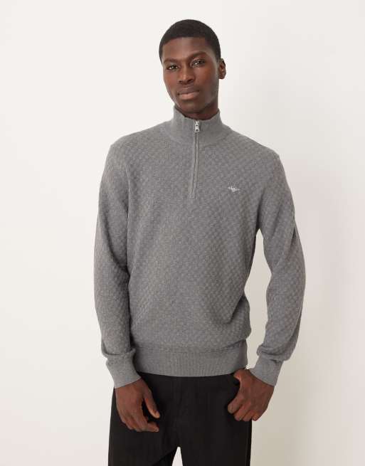 GANT – Mörkgrå, texturstickad tröja med sköldlogga och kort dragkedja