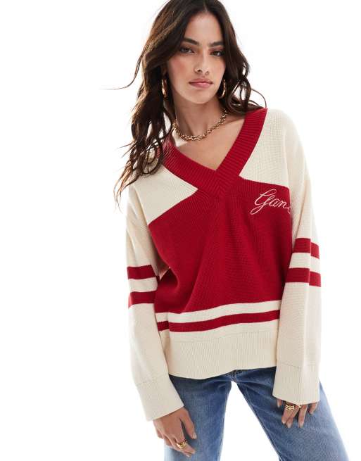 GANT – Röd, v-ringad tröja i collegestil med logga