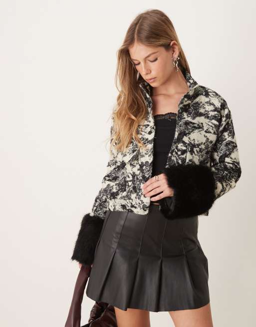 Ghospell – Svartvit jacka med ståkrage och fuskpälsmuddar i ärmslut