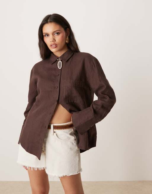 Gina Tricot – Brun, avslappnad linneskjorta med långa ärmar