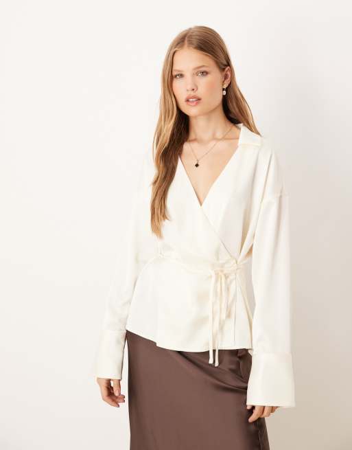 Gina Tricot – Gräddvit skjorta i satin med knytning framtill