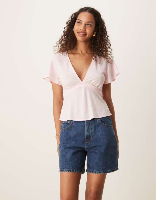 Gina Tricot – Ljusrosa topp med korta ärmar, v-ringning och rosettknytning baktill