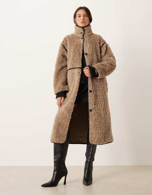 Gina Tricot – Mörkbeige midikappa i fuskpäls med kantband