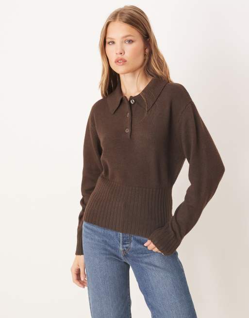 Gina Tricot – Mörkbrun, stickad tröja med långa ärmar och krage