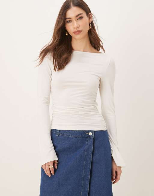 Gina Tricot – Naturvit, mjuk topp med långa ärmar och båtringning