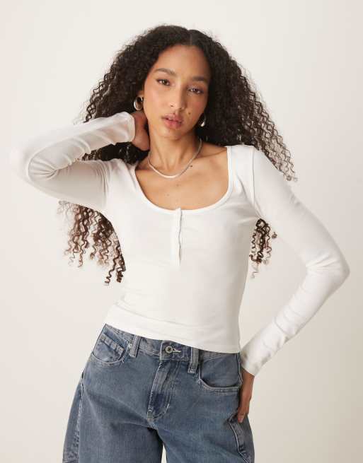 Gina Tricot – Naturvit topp i jersey med långa ärmar och dolda knappar framtill