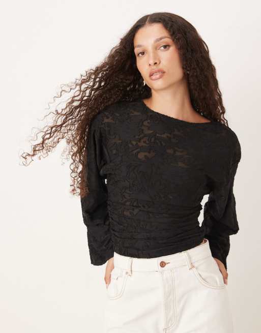 Gina Tricot – Svart, strukturmönstrad topp med rund halsringning och långa ärmar