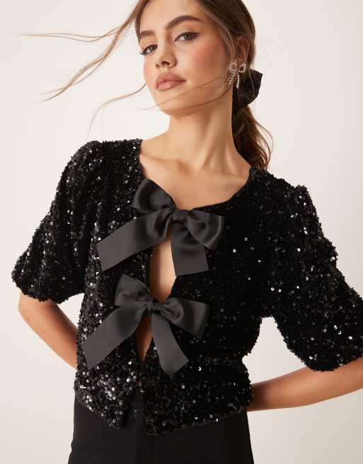 Gina Tricot – Svart topp i satin med korta ärmar, paljetter och rosett framtill