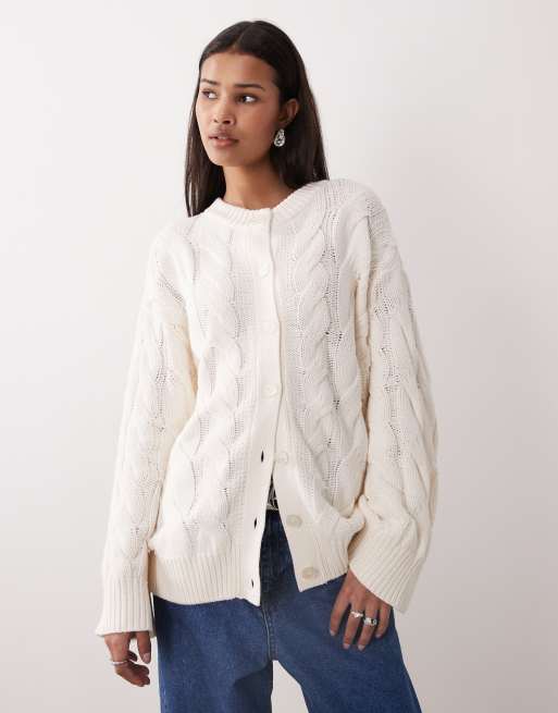 Gina Tricot – Vit, kabelstickad kofta i bomullsrikt tyg
