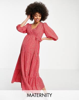 Glamorous – Bloom – Röd, småmönstrad maxiklänning i omlottdesign med ballongärmar