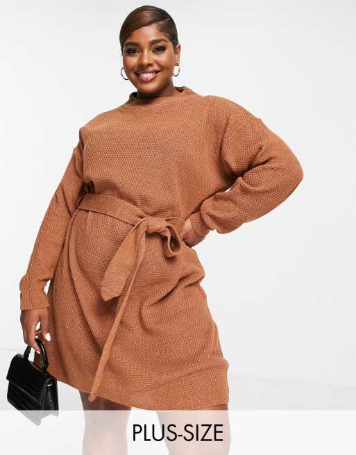 Glamorous Curve – Brun, kort tröjklänning med lång ärm och knytning i midjan