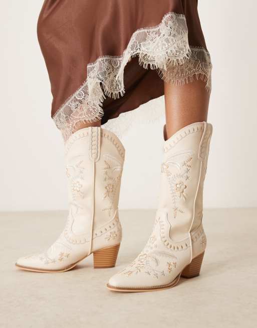Glamorous Wide Fit – Gräddvita, knähöga boots i cowboystil med broderi och bred passform