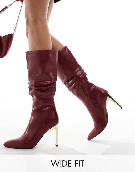 Glamorous Wide Fit – Vinröda, rynkade, knähöga boots med guldfärgade klackar och bred passform