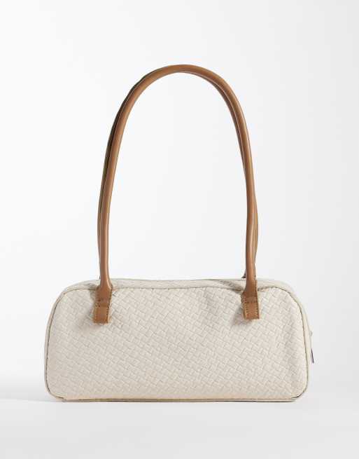 Glamorous – Gräddvit, avlång axelväska i flätad raffia med detaljer i läderimitation